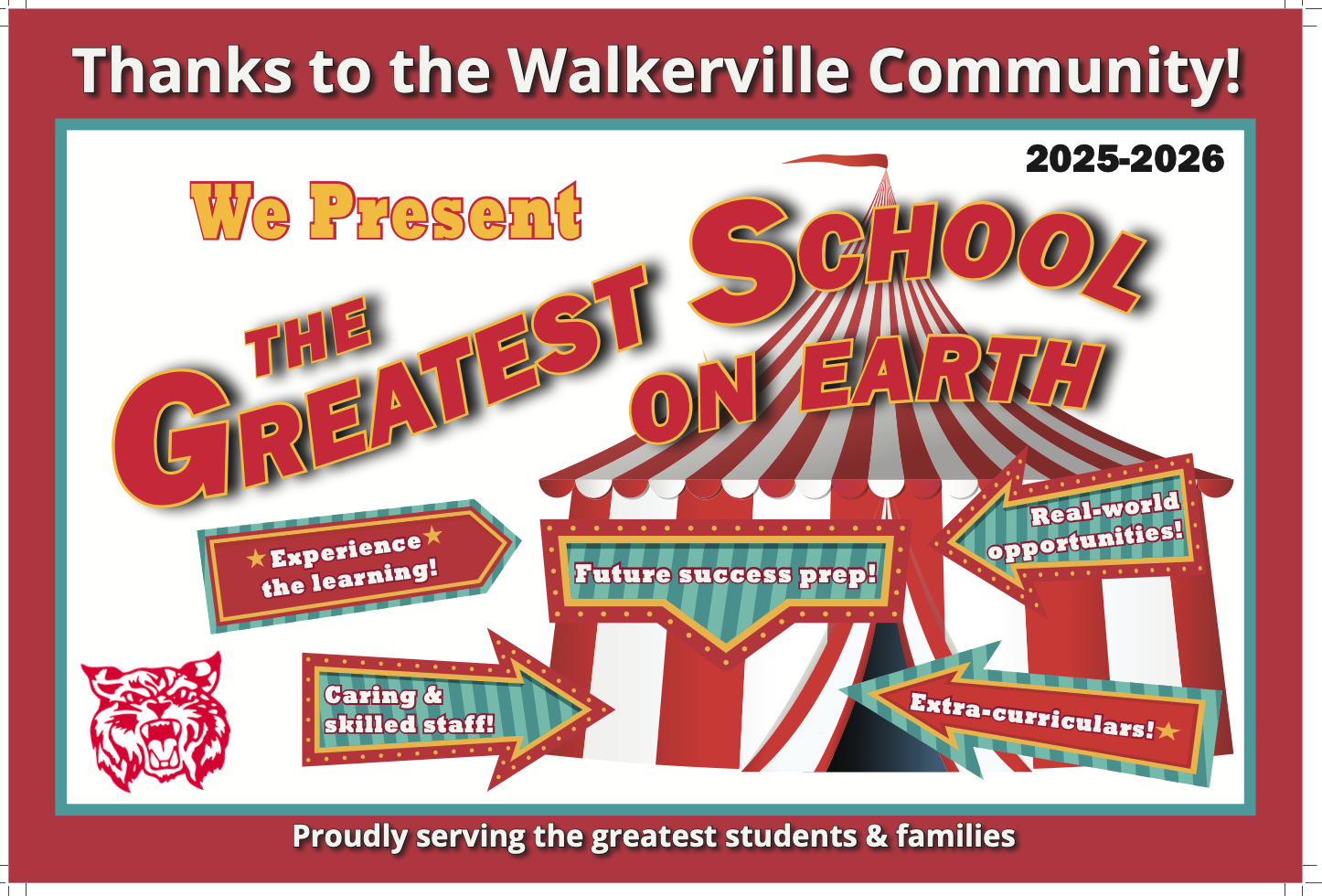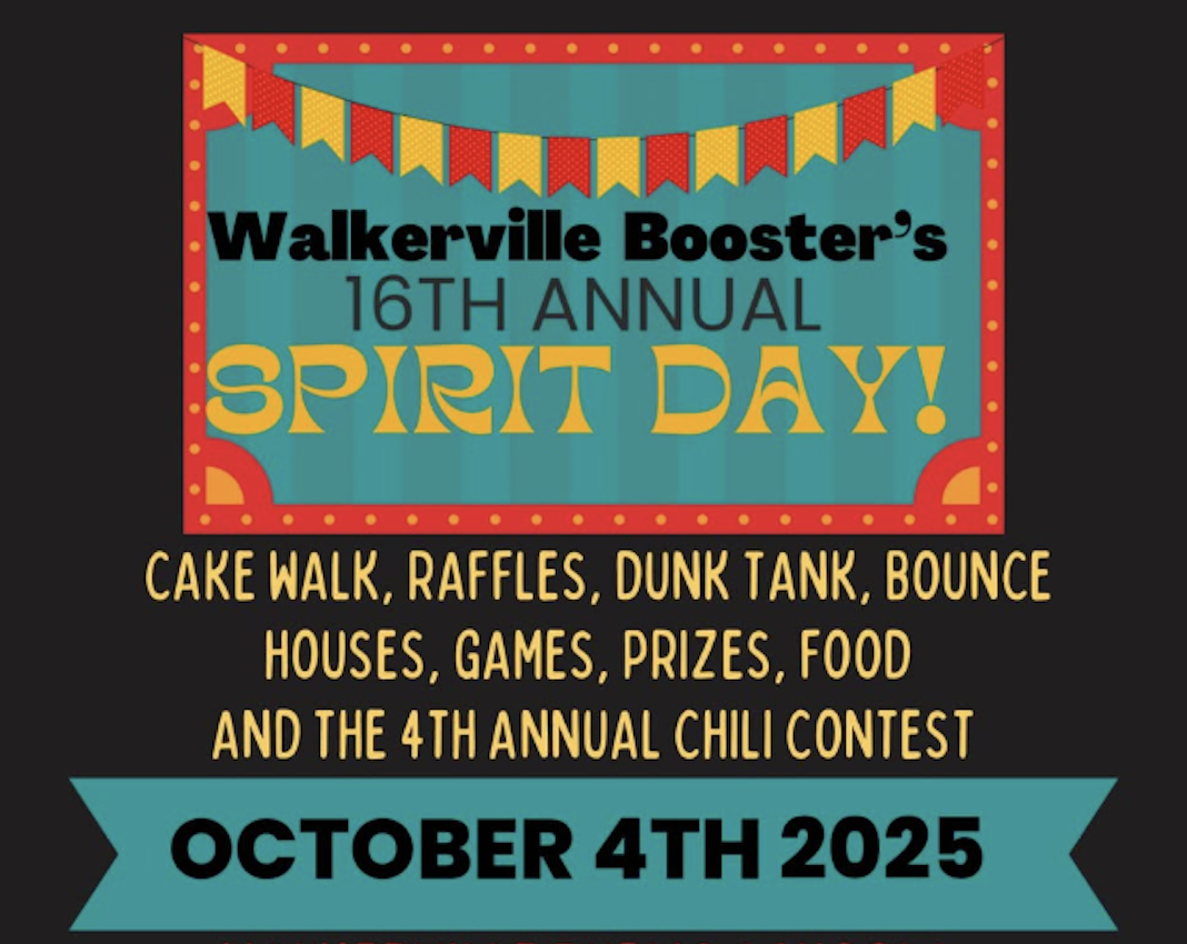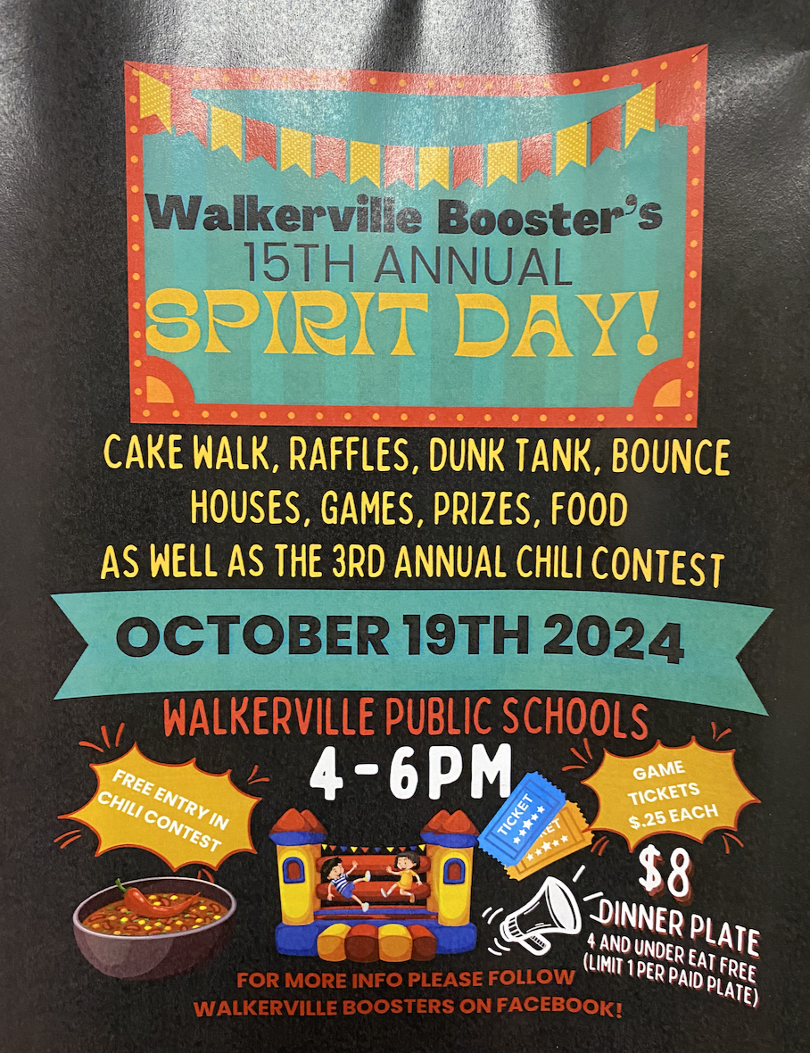 Join in the fun! The 16th Annual Spirit Day is Saturday, Oct. 4, from 4-6 pm. Sponsored by the Walkerville Boosters, this Wildcat-Powered event features a cake walk, raffles, dunk tank, bounce house, games, prizes, food, and more! It also includes the 4th Annual Chili Contest. The cost of each dinner plate is $8, with kids under age 4 eating free. See you there!