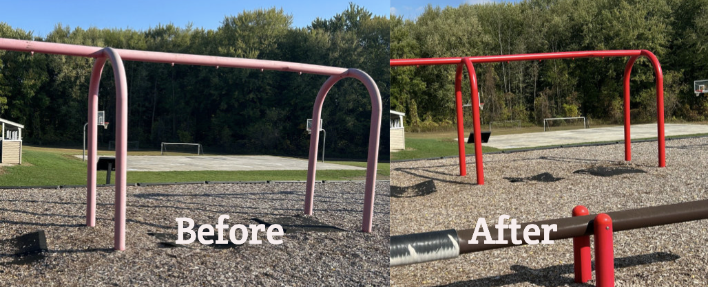 Give Miss Jen Masta a can of red paint and presto change-o! Before the installation of new swing seats, Jen painted the old faded swing structures to make them look as good as new, too! As you can imagine, the students are excited to be back in the swing of things at recess.